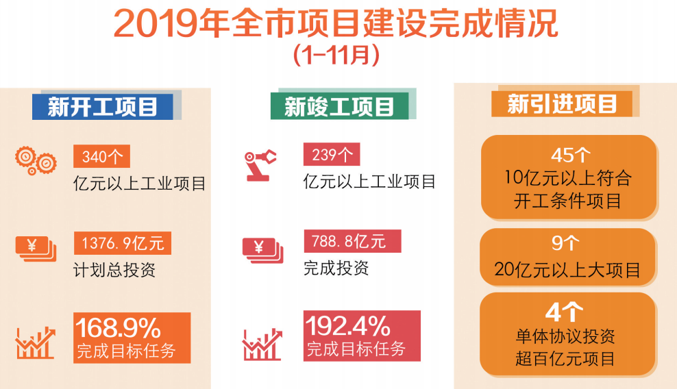 项目突破不能止步于项目签约,还需加快项目落地建设,进而转化为现实生产力和经济增长点。宿迁市委常委会坚持单双月分别听取县(区)和相关部门重大项目推进情况汇报,每季度召开一次项目现场观摩推进会,各地突出项目目标化、目标节点化、节点责任化,确保项目落得稳、建得快、发展得好。1-11月,宿迁全市新开工亿元以上工业项目340个,计划总投资1376.9亿元,完成目标任务的168.9%;新竣工亿元以上工业项目239个,完成投资788.8亿元,完成目标任务的192.4%。