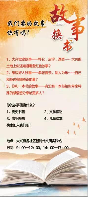 为了深入挖掘本地红色故事、身边好人好事等珍贵资源,宿豫区大兴镇推出“故事换书”特别活动。