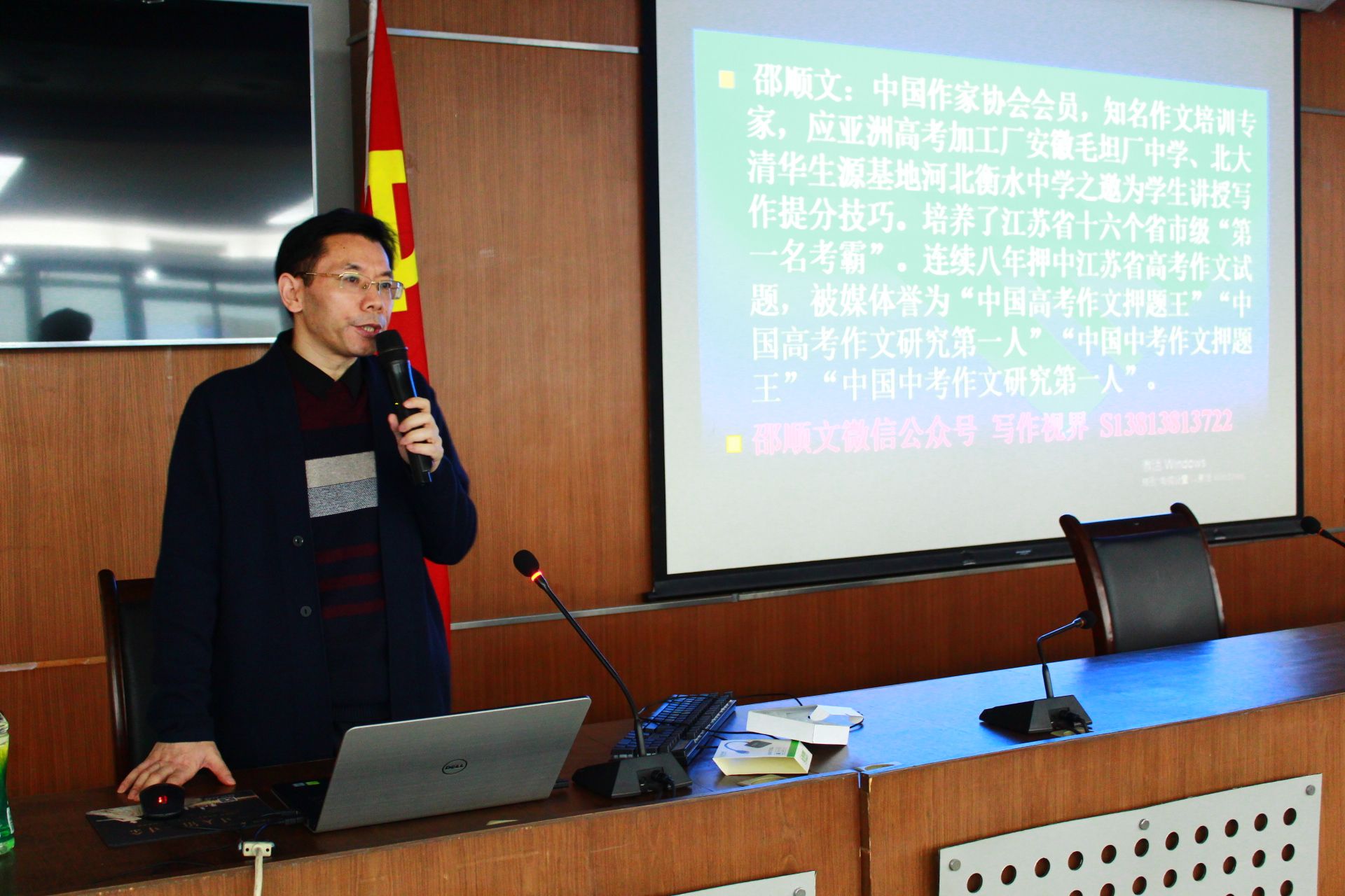 此次活动邀请了中国作家协会、第四届冰心散文奖得主邵顺文为六年级、初一、初二学段的学生,从阅读书籍的选择,如何作阅读笔记,写作的体裁、审题、立意、内容及结尾等方面,详细讲解了阅读和写作的重要性。他建议同学们在阅读时要多读富含哲理的书籍,在写作过程中要写出新意,不要离题;写出深度,不要偏激;写出跌宕,不要捏造;写出细节,不要沉溺;写出灵气,不要缥缈。