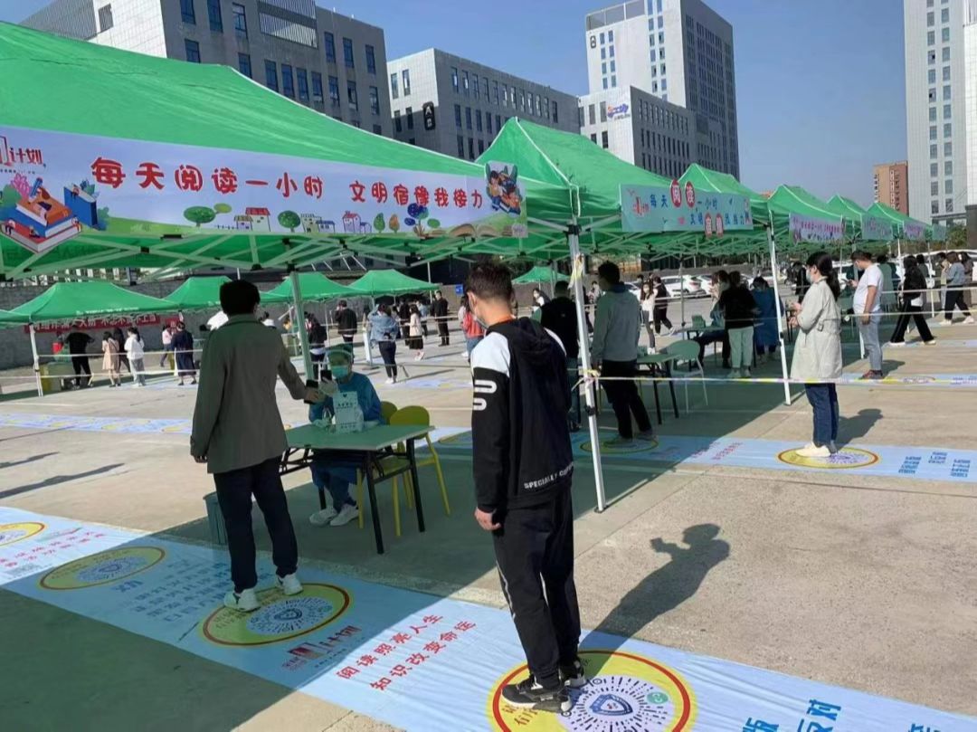 核酸采样点是疫情防控的“哨点”,也是群众家门口的“宣传阵地”。为更好地服务群众,让市民在“一米线”等候时品味书香,凝聚起阅读抗疫的精神力量,宿迁在部分固定核酸采样点以及其他需要排队的场所,打造出一批书香“一米线”宣传示范点。