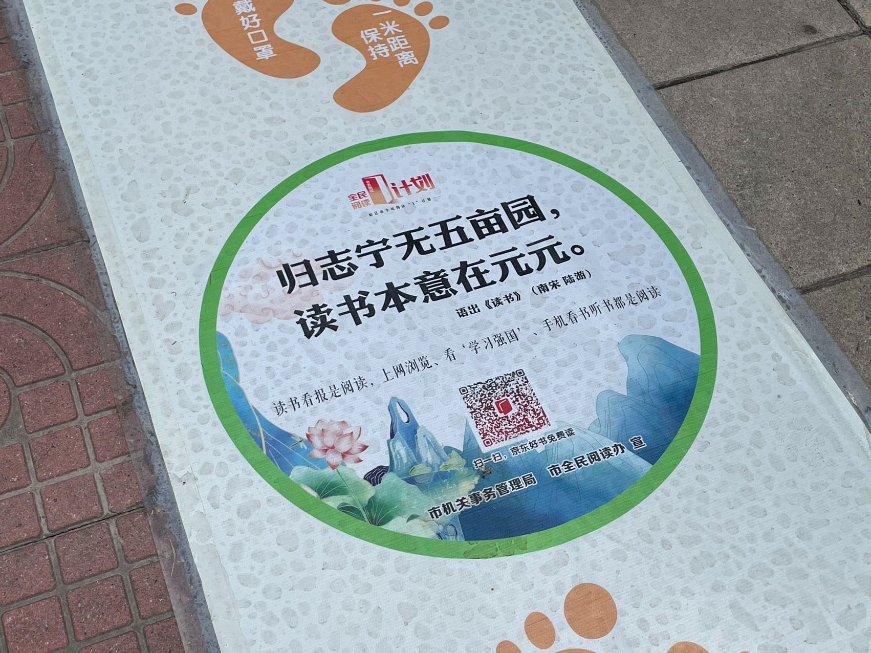 根据不同点位实际情况,书香“一米线”的样式在保留疫情防控提示功能的前提下,融入古诗词、全民阅读“1计划”主题宣传等内容,采用提示地贴、立式站牌、手举牌、公益广告等宣传形式,充分体现全民阅读书香抗疫的元素。