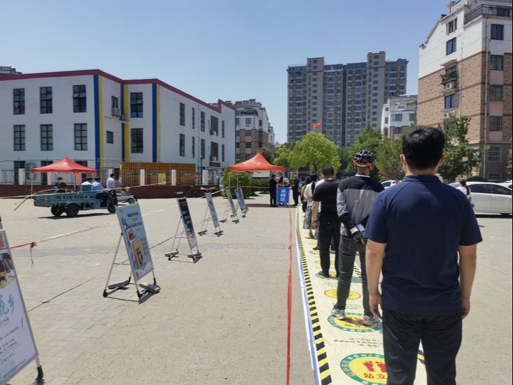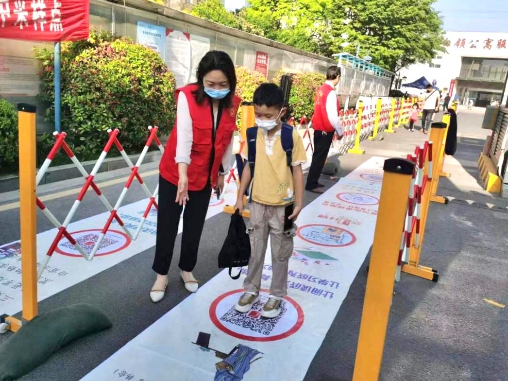 核酸采样现场诗情化“疫”,家长们带着孩子一起学习研读“一米线”上的古诗名句。在沭阳县沭城街道新桥社区核酸采样点,鲜亮的黄色地贴融入了耳熟能详的古诗词、全民阅读“1计划”主题宣传等内容,既能提醒居民排队时保持安全距离,又方便居民阅读。