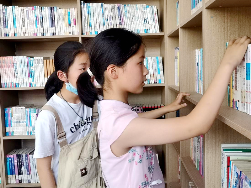 7月20日,泗阳县庄圩乡居住在集镇区府前名邸小区的12岁潘雨欣和卢雅婷打着伞冒雨,来到乡综合文化站图书室,各自从书架上挑选到心仪的图书后,和其他暑期学生读者一样,安静地坐到阅读区域沉浸其中。