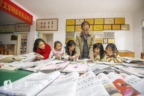 11月9日,在沭阳县龙庙镇沙埝村崇孝苑农家院里,退休干部陈国友正在与村里的孩子一起读书看报。