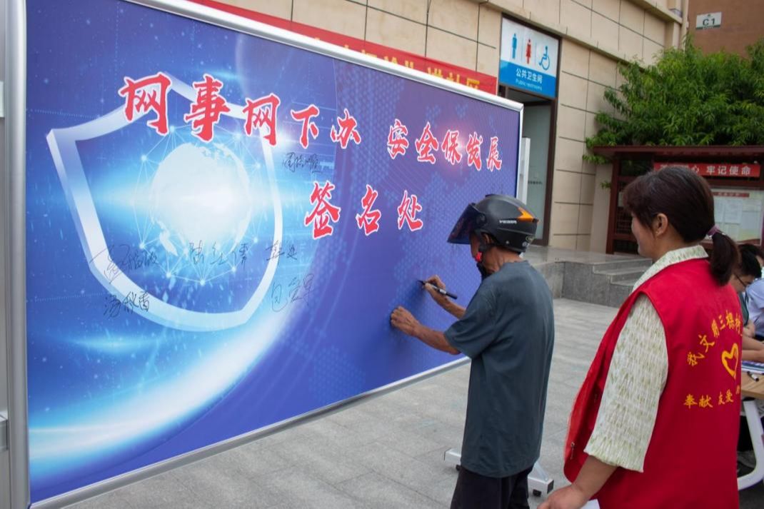 此外,韩庄社区还制作了签名承诺墙,让参加活动的居民在签名墙上签下自己的名字,号召居民不仅要做互联网的使用者、参与者,还要做好网络安全的维护者,共同构建和谐、安全、文明、清朗的网络环境。