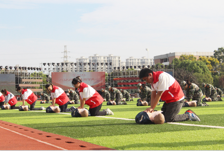校红十字会成员和建筑工程学院新生的心肺复苏急救技能展示,动作规范,分秒必争,展现出良好的应变能力和心理素质。