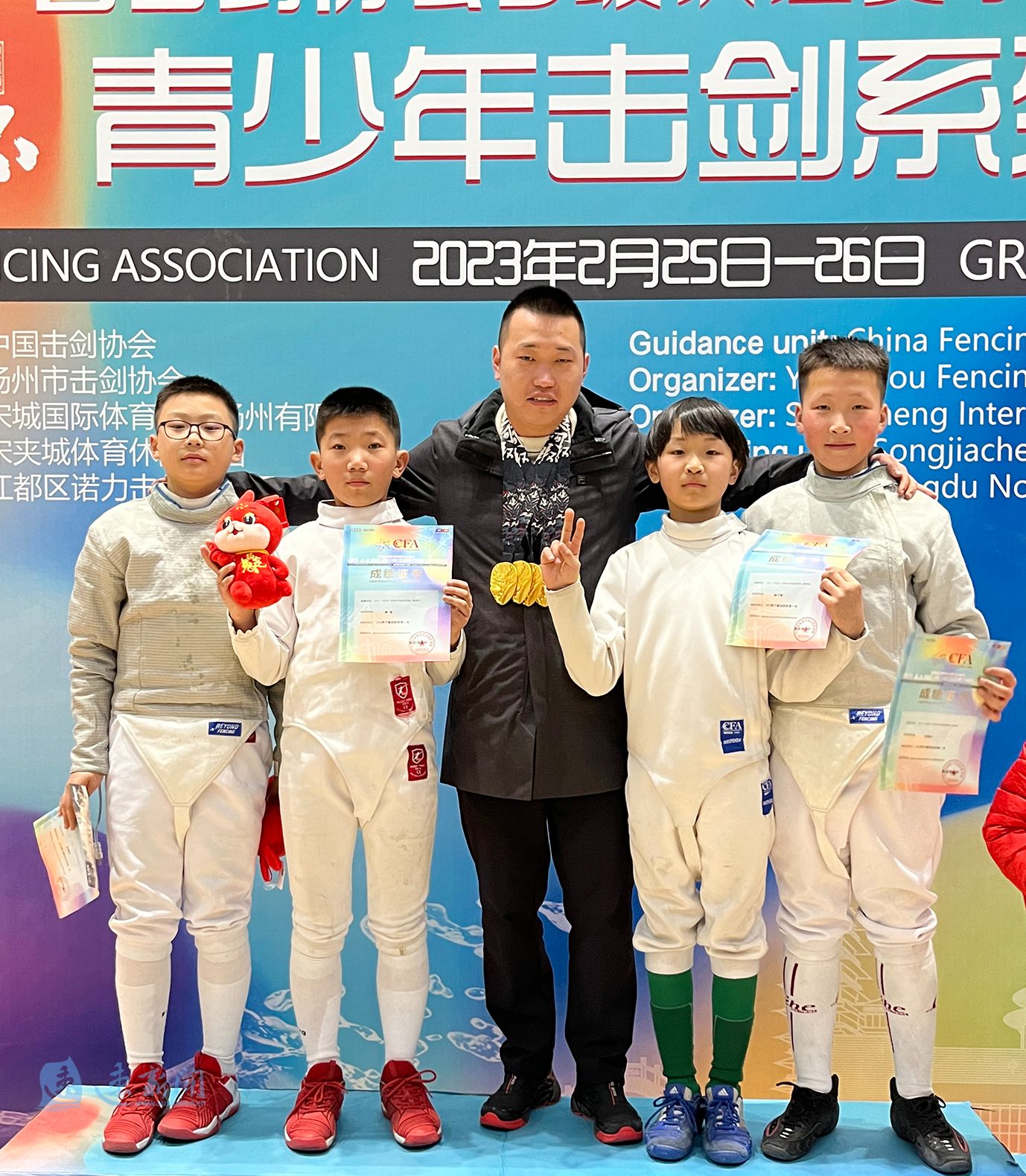 据宿迁市击剑队主教练李翱介绍,杨子懿、刘首尔、孙搏远、韩硕平均年龄12岁,他们是宿迁市击剑队的正式队员,曾参加过多项省内击剑比赛。在2月26日的赛程中,12岁的杨子懿发挥出色,成功战胜了来自上海、南京、扬州等地的选手,夺得U12男子佩剑个人冠军。在之后开展的U12男子佩剑团体比赛中,四名小队员众志成城、配合紧密,最终成功拿下该项目的金牌。
