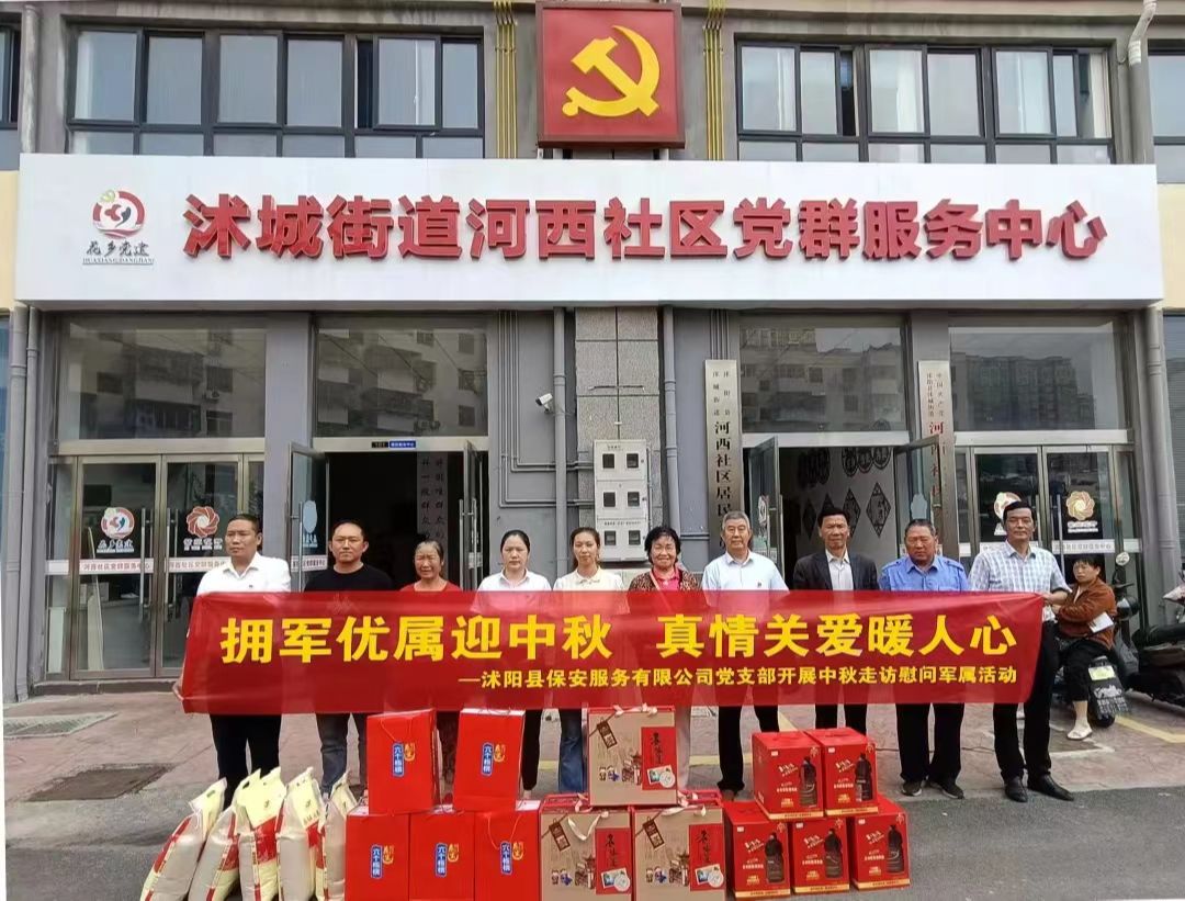 秋风送爽,丹桂飘香。在2023年中秋、国庆即将到来之际,9月27日下午,沭阳县保安服务有限公司党支部组织党员开展“拥军优属迎中秋•真情关爱暖人心”活动,他们来到沭城街道河西社区开展走访慰问活动,向退役军人家属送上节日祝福。
