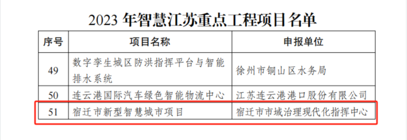 (速新闻记者 高云龙)近期,由宿迁市市域社会治理现代化指挥中心牵头实施的“宿迁市域治理指挥平台”、宿迁市新型智慧城市项目和“标准化支撑宿迁新型智慧城市建设”,分别入选“2023数字江苏建设优秀实践成果”、2023年智慧江苏重点工程和2023年数字政府标准化建设评估指数全国典型实践50强案例。