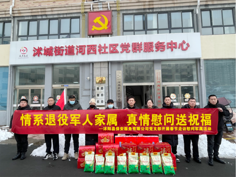 随着新春佳节临近,为全面深入学习宣传贯彻党的二十大精神,2月5 日下午,沭阳县保安服务有限公司党支部组织党员来到沭城街道,与河西社区党支部开展结对帮扶走访慰问活动,为退役军人家属送去大米、油、牛奶和大礼盒等慰问品,将关爱服务和走访慰问活动融入党员冬训工作中,促进理论学习和关爱服务相结合,切实发挥党员先锋模范和党组织战斗堡垒作用。(胡东洋 刘子涵)