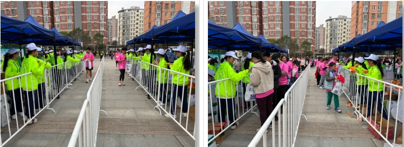 在欢乐跑终点,志愿者们分工明确,各司其职。指引组的同学们手持指示牌,耐心为选手指引路线;物资分发组的志愿者们将补给品整齐摆放,及时为选手提供能量支持;疏散组的同学们则密切关注人流动态,确保终点秩序井然。他们的身影在人群中穿梭,成为一道亮丽的风景线。