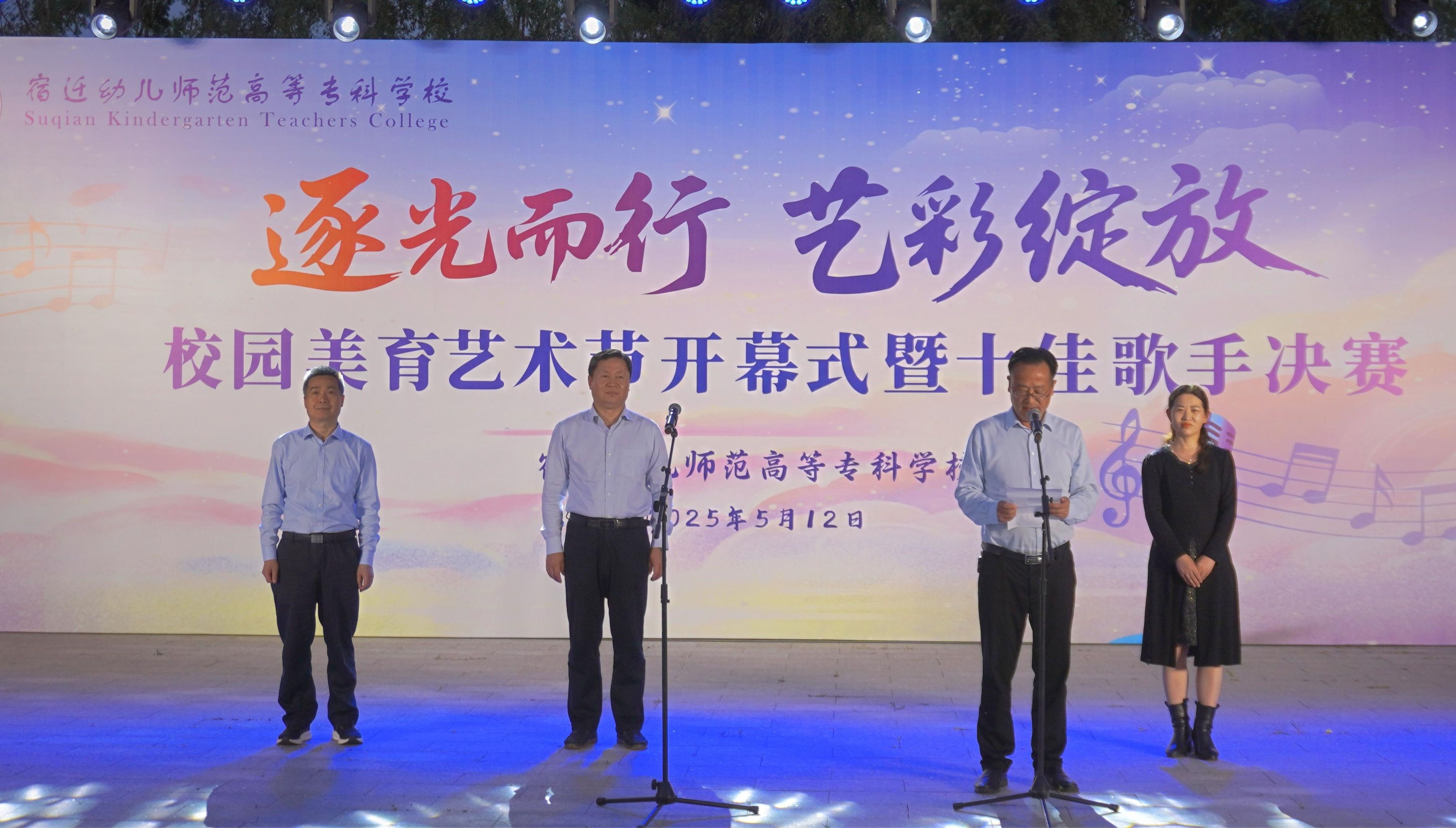 当星光点亮青春的舞台,当歌声唱响梦想的华章,5 月 12 日晚,宿迁幼儿师范高等专科学校(以下简称“宿迁幼专”)沁园广场化身音乐的海洋,“逐光而行 艺彩绽放” 2025校园美育艺术节开幕式暨十佳歌手决赛在此震撼启幕。全校 2000 余名师生齐聚一堂,共同见证这场融合艺术与青春的视听盛宴。学校党委书记、校长韩勇宣布艺术节正式开幕,副校长刘芝兵主持开幕式并致辞。校领导班子成员刘春水、高凯及中层干部也到场观赛,为选手们加油助威。