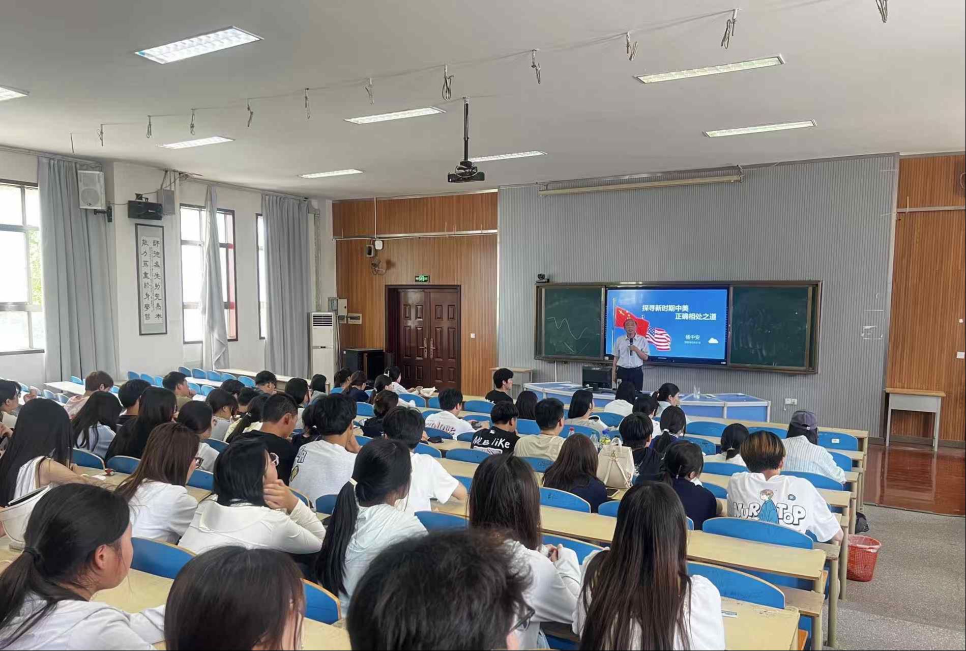 此外,副校长张彦芝以《谱写全球南方团结合作的新篇章》为题,立足国际政治经济格局,结合 “一带一路” 生动实践,带领学生以开放视角看待发展中国家合作,树立人类命运共同体意识;副校长刘芝兵在《以人口高质量发展支撑中国式现代化》课程中,从人口结构、教育红利等多个维度,深入解读人口与现代化的辩证关系,启发学生用专业实践推动人口质量提升与社会可持续发展;纪委书记杨中安的《探寻新时期中美正确相处之道》结合国际热点,通过梳理历史经纬与现实分析,引导学生理性看待大国关系,培养辩证思维与国际视野;校党委委员高凯在《中国经济稳舵定向》课程里,用直观的数据图表解读宏观经济形势,增强学生对中国特色社会主义制度优势的深刻理解。
