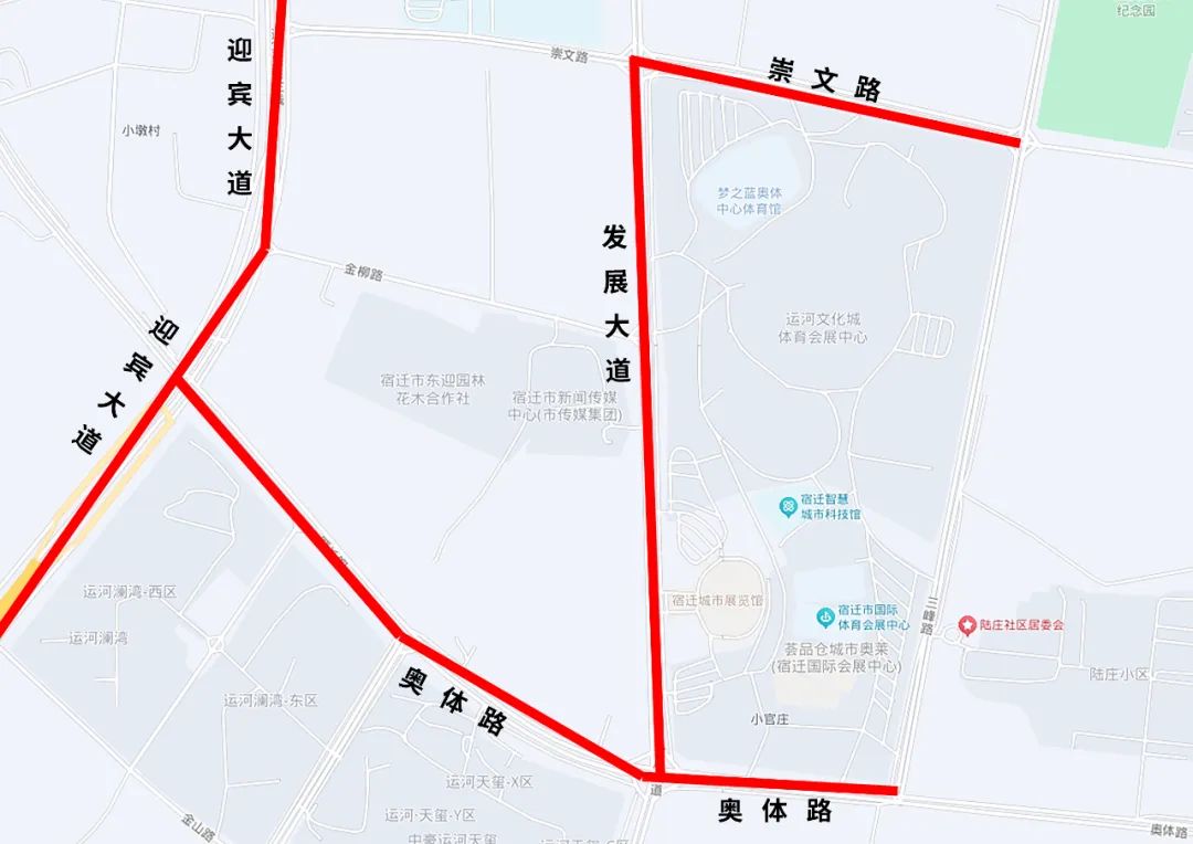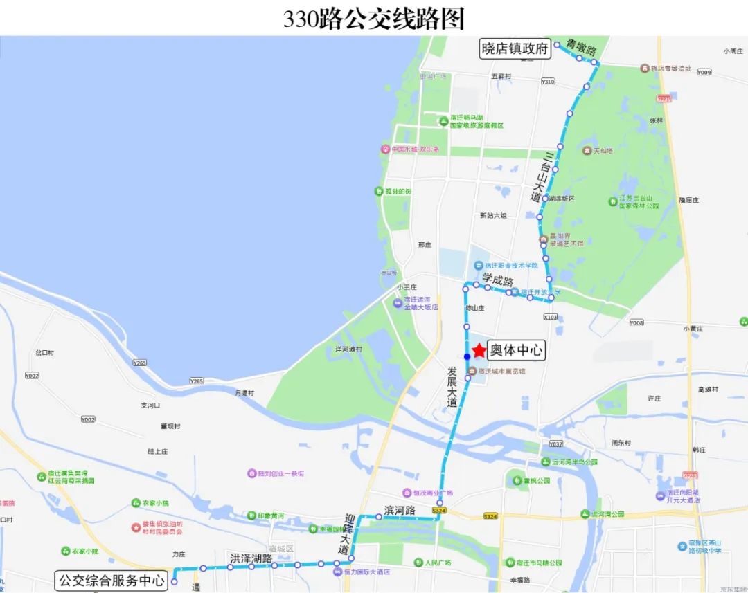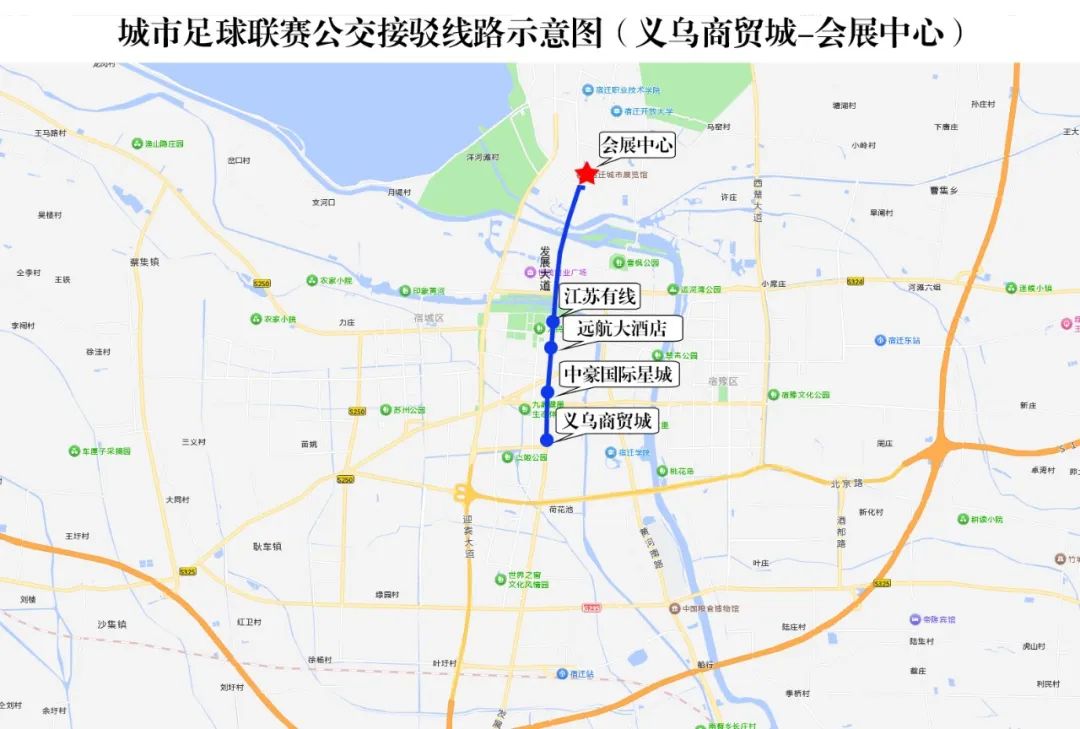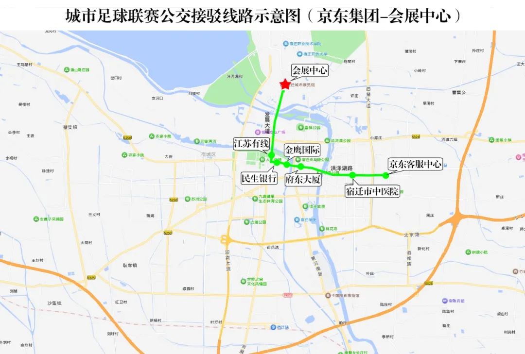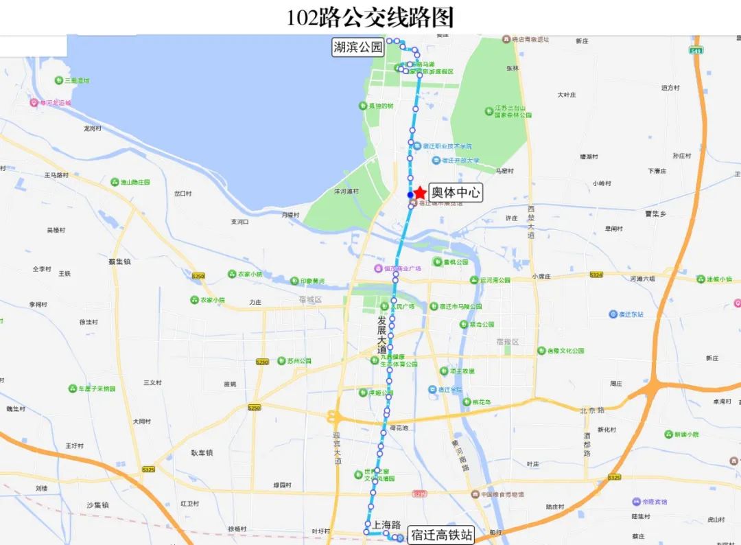 具体线路:洪泽湖路---发展大道---奥体路---宿迁国际会展中心(奥莱广场)