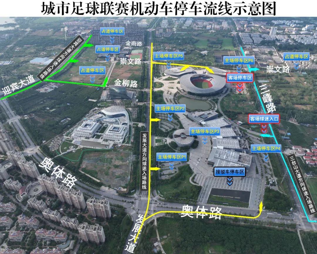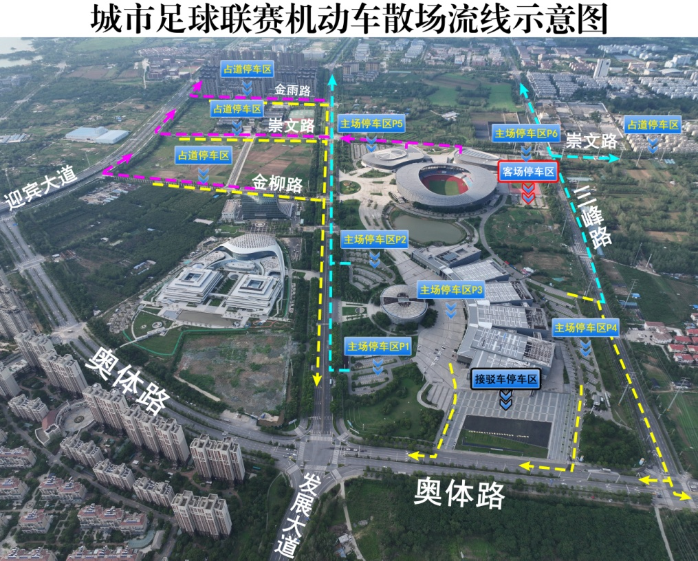 从迎宾大道前往宿迁梦之蓝·奥体中心观赛的球迷,可将车辆停放在金柳路(迎宾大道至发展大道段)、崇文路(迎宾大道至发展大道段)、金雨路(迎宾大道至发展大道段)。