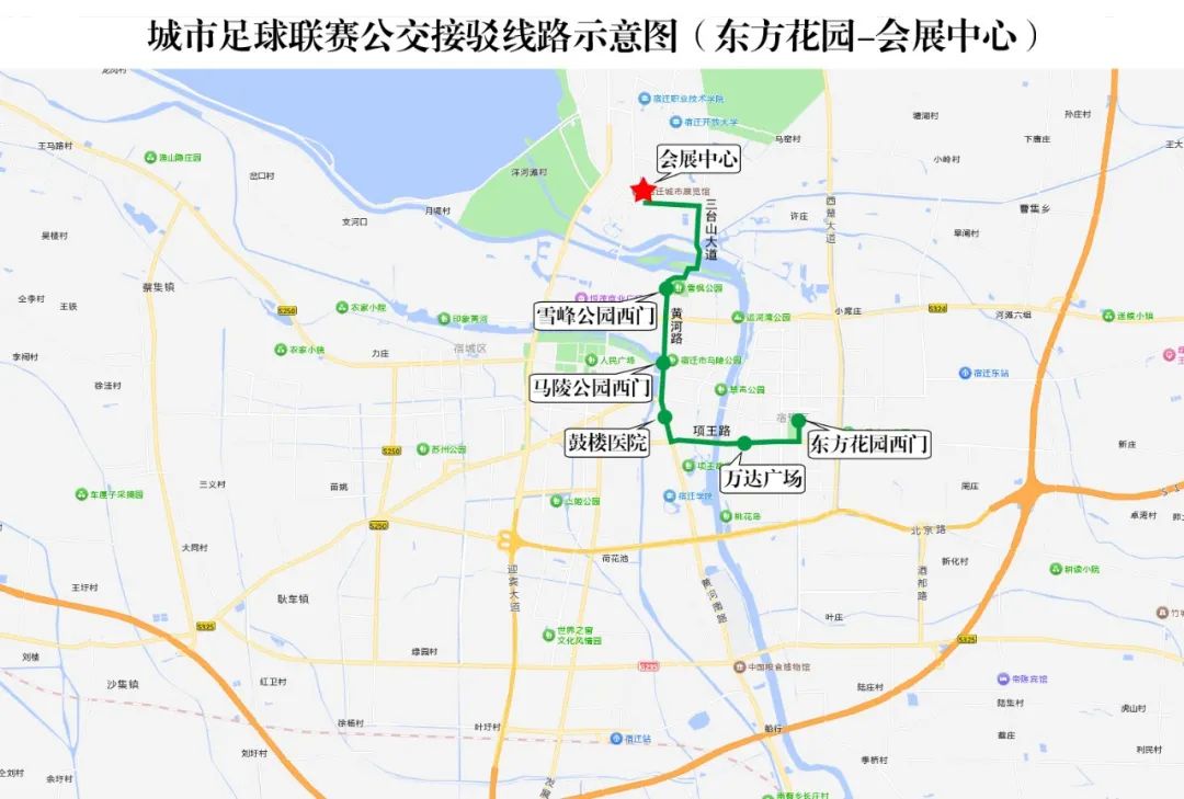 散场接驳:球赛结束散场时,接驳公交停放在宿迁国际会展中心奥莱广场(下车点),观赛球迷可乘坐相应公交车原路返回、原停靠站点下车,高铁站接驳点不再返回。