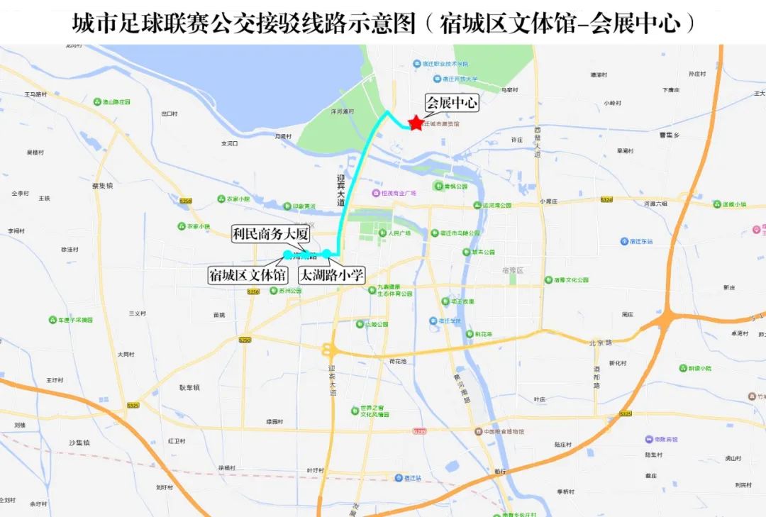 具体线路:红海大道---微山湖路---迎宾大道---奥体路---宿迁国际会展中心(奥莱广场)