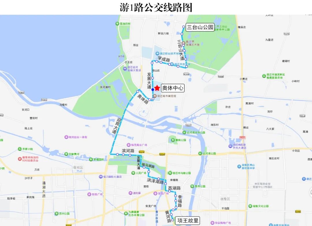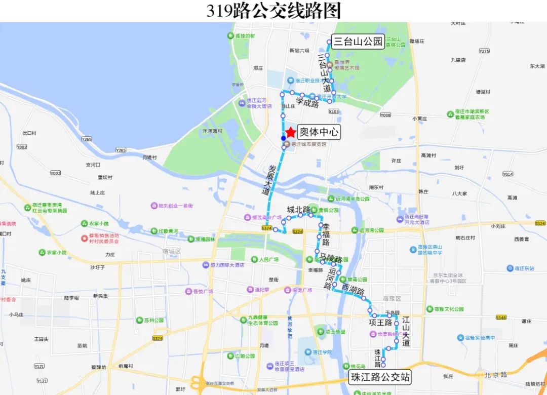 具体线路:江山大道---项王路---黄河路---三台山大道---奥体路---宿迁国际会展中心(奥莱广场)