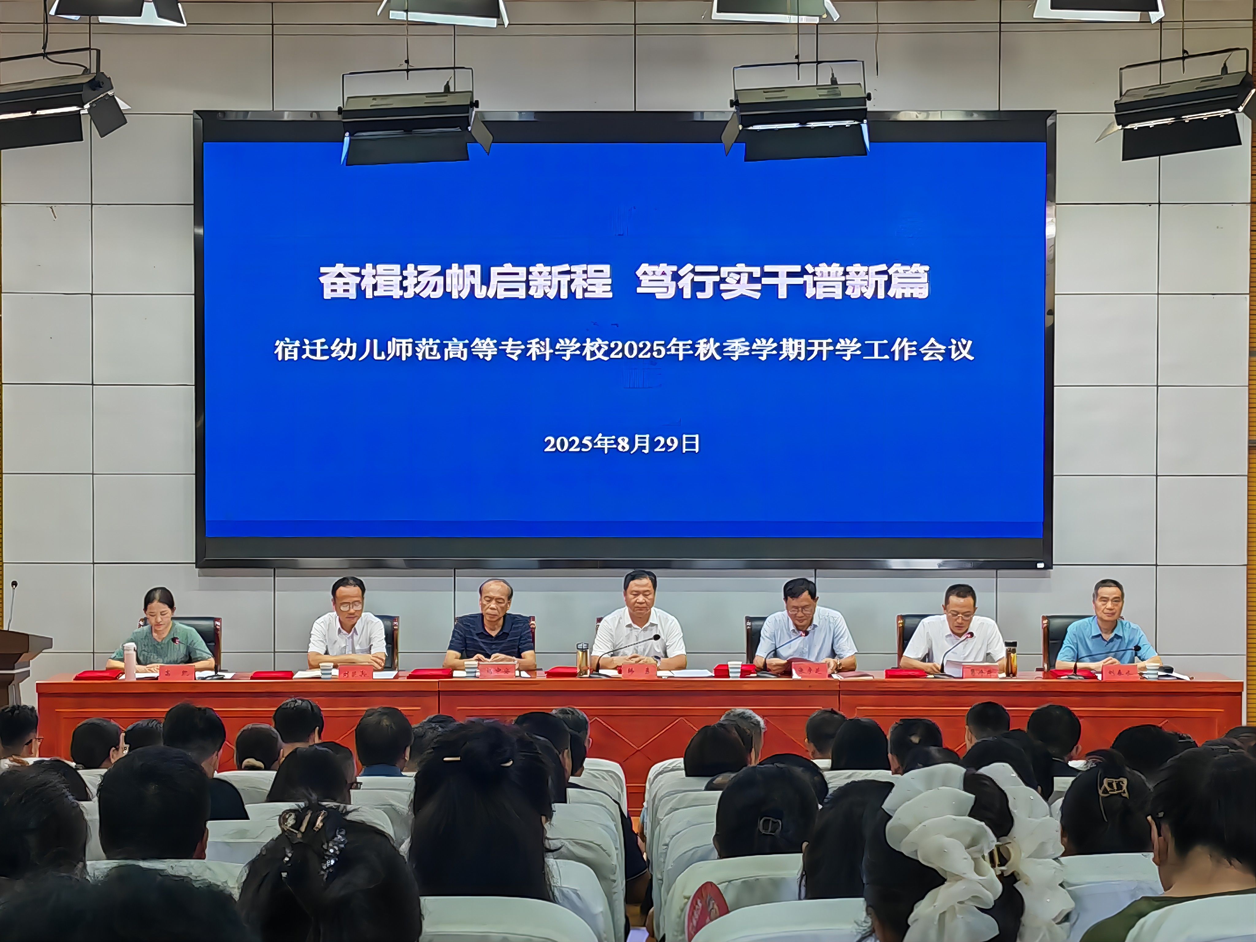 8月29日,宿迁幼儿师范高等专科学校(简称“宿迁幼专”)召开2025年秋季学期开学工作会议。校领导班子及全体教职工参会。会议以“表彰先进、交流经验、凝聚共识、部署任务”为核心,明确了新学期工作重点与学校近期发展目标,旨在动员全校教职工开创学校事业发展新局面。