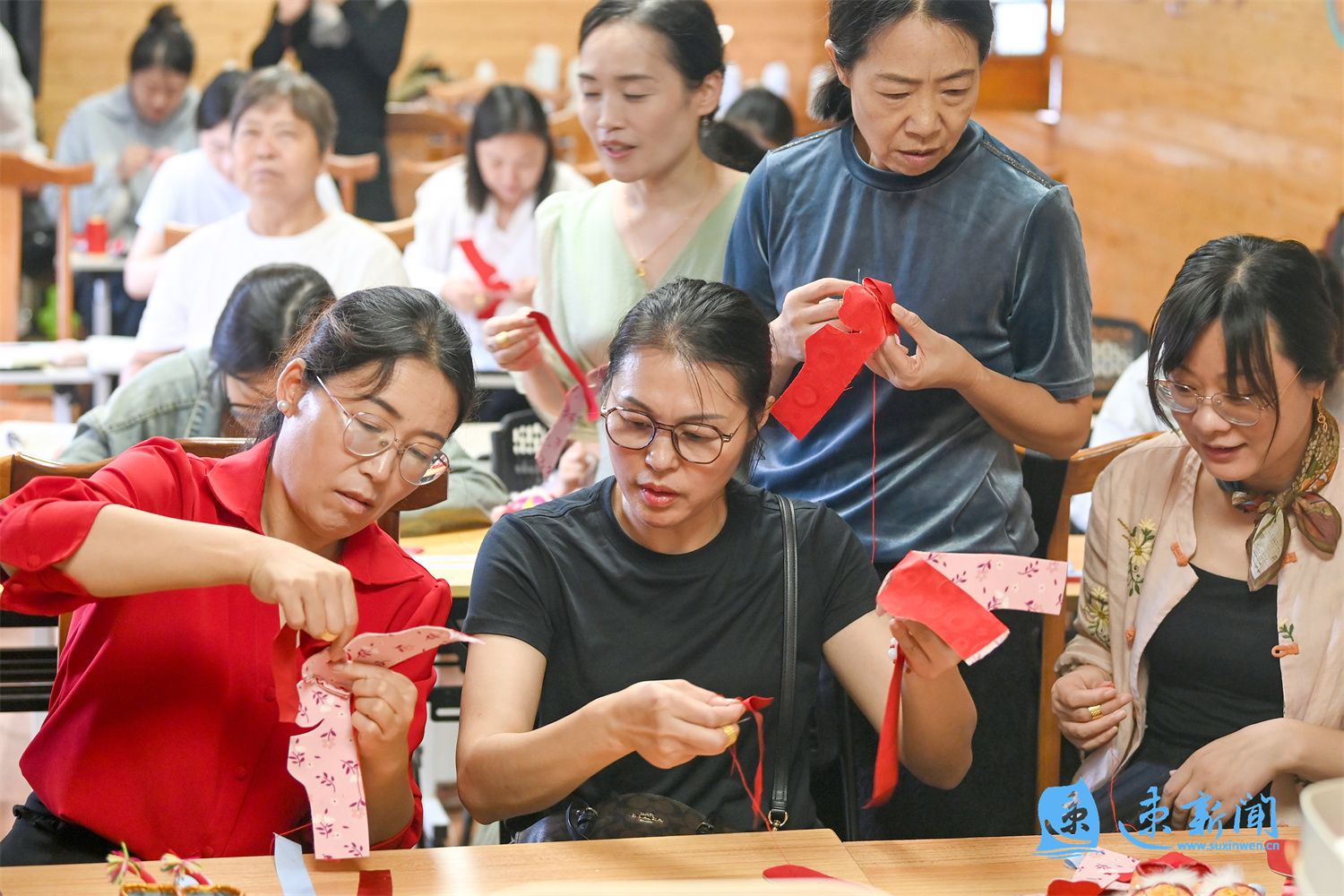 9月12日上午,宿迁市文化馆在宿城区古城街道府前小区志愿坊举办“宿秀千技——非遗在社区”虎头鞋体验活动。非遗传承人孔新菊现场教学,从打袼褙、纳鞋底到绣虎脸,演示了虎头鞋制作的十余道工序。