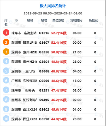 △23日06时至24日06时,广东24小时极大风最大值52.7m/s(16级),发生在广东省珠海市香洲区庙湾主站站[G1216] 。来源:广东省气象局