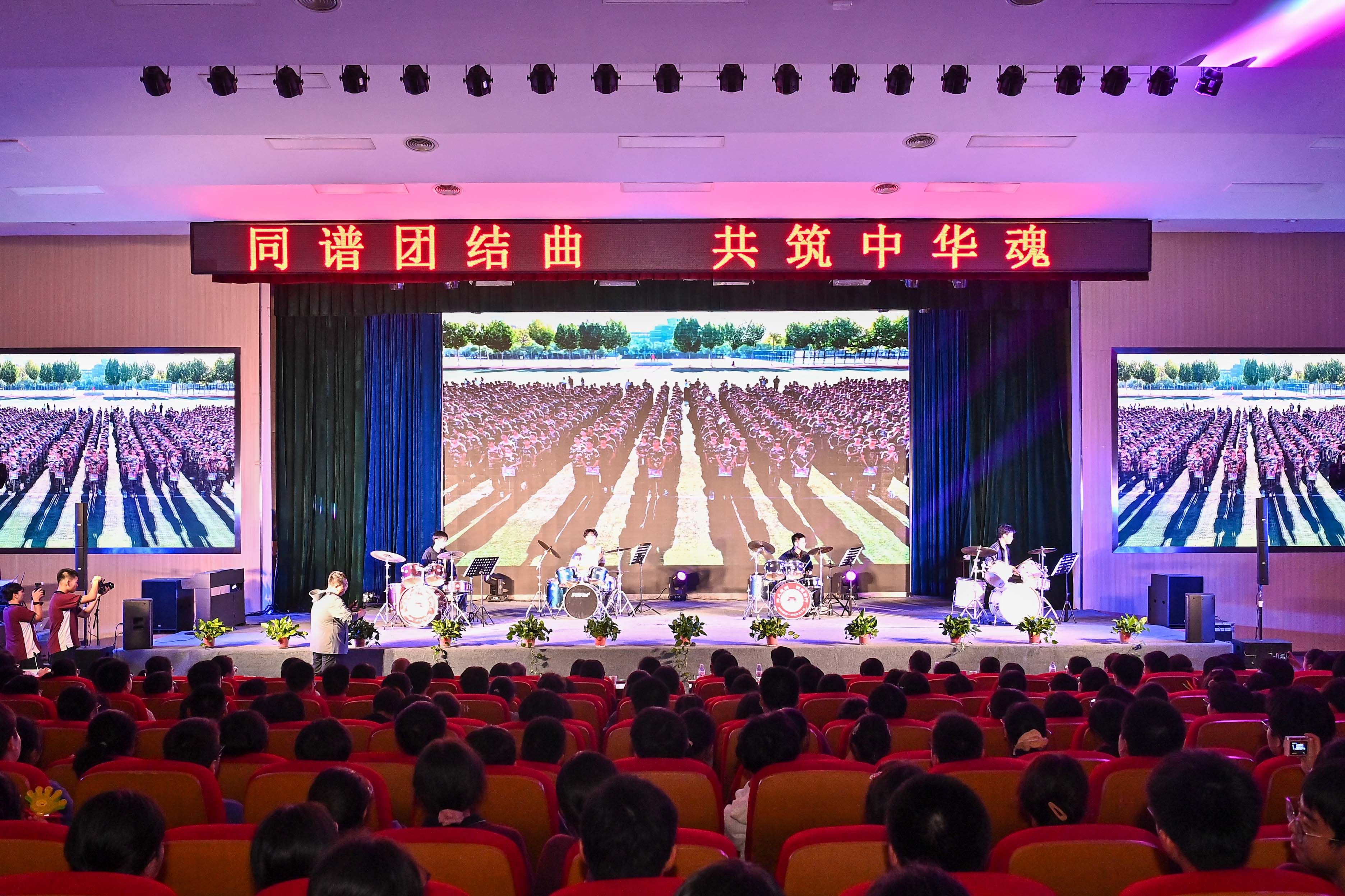 当晚的文艺汇演以13个多元节目串联,涵盖诗歌朗诵、歌舞、器乐、情景剧等多种形式,每一个节目都承载着对祖国的热爱与对民族的深情。爵士鼓表演《光辉岁月》率先登场,激昂的节奏瞬间点燃全场气氛,鼓手们默契的配合展现出新时代青年的蓬勃朝气;两校学子联袂带来的诗歌朗诵《同一轮明月,同一个家园》,以“无论来自天山脚下还是大湖之滨,我们共沐同一轮明月”的深情告白,引发全场共鸣。