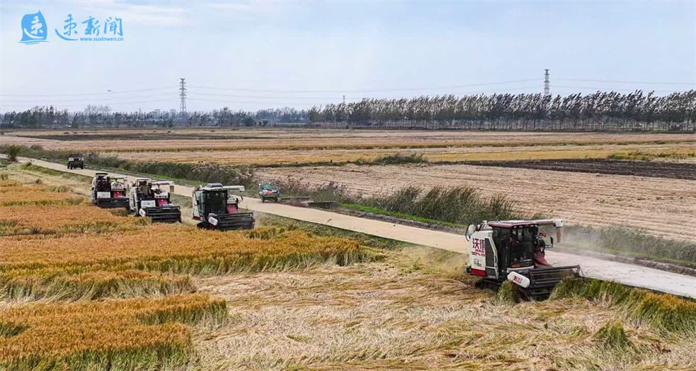 11月6日,泗洪县梅花镇抢抓晴好天气窗口期,集中力量收割水稻,全力保障秋粮归仓。