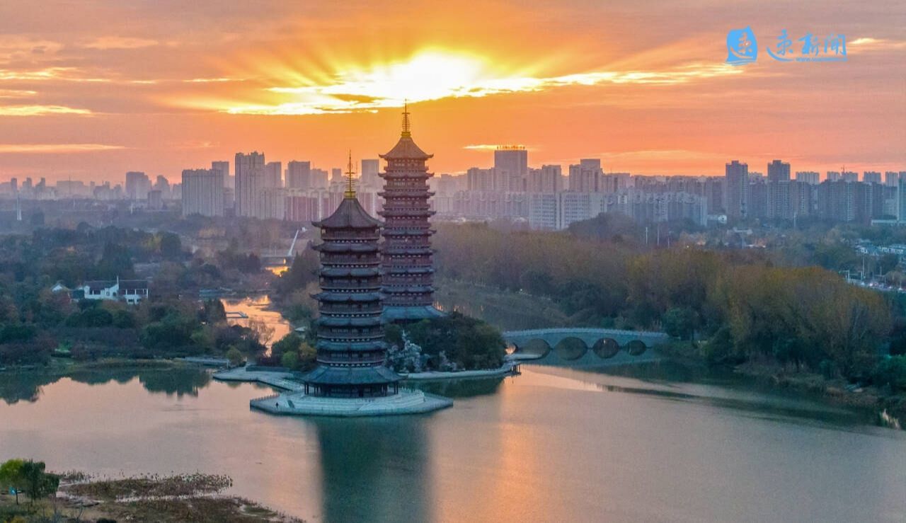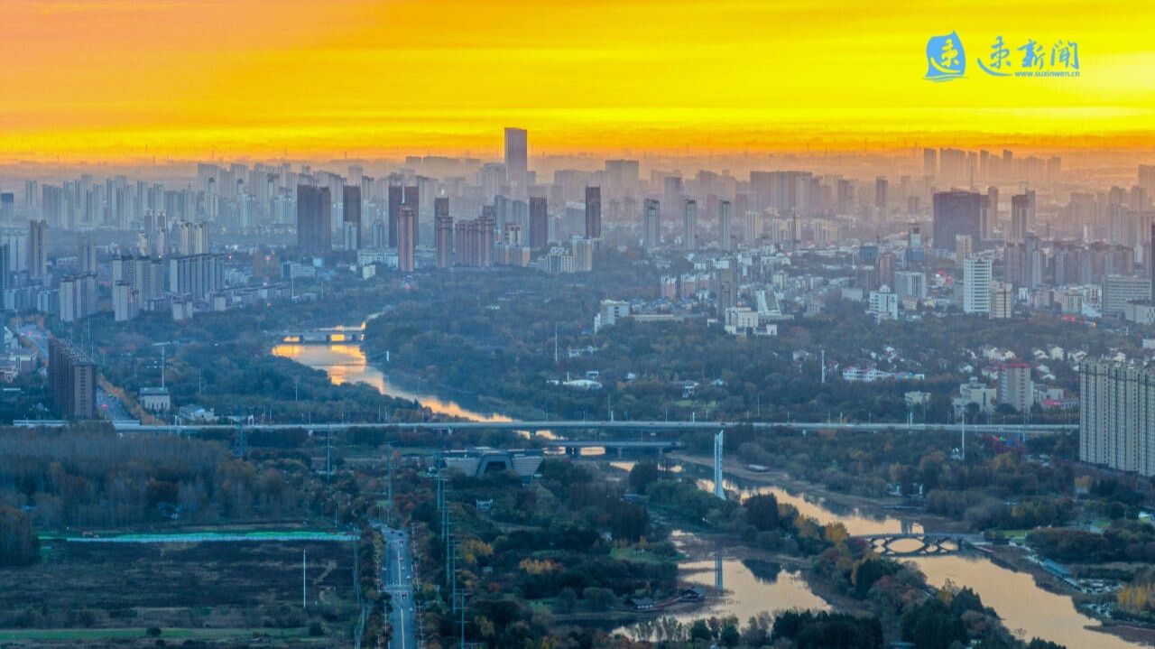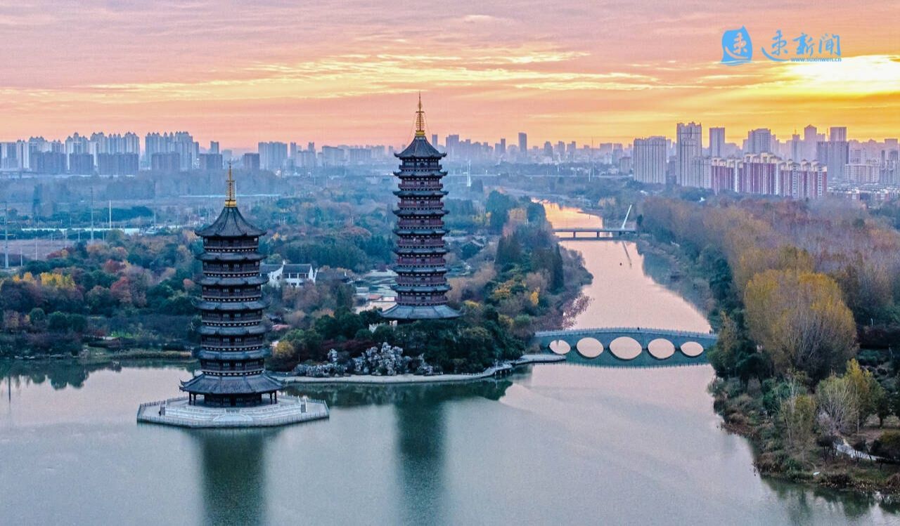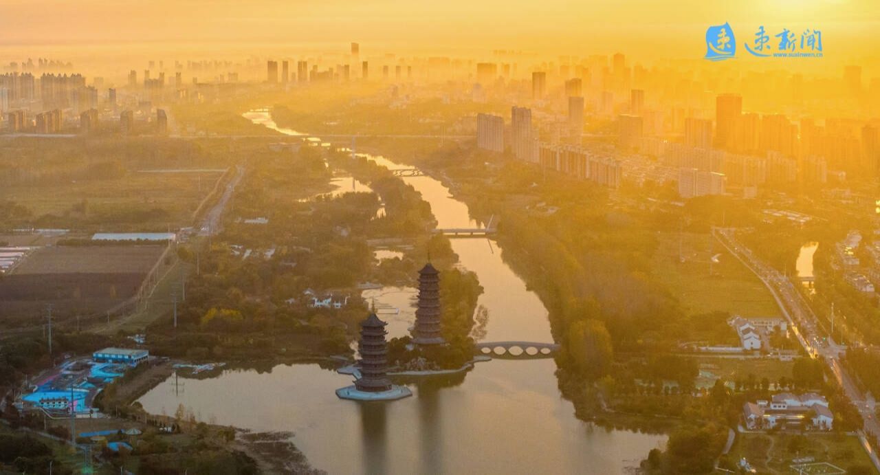 11月11日,宿迁市古黄河两岸色彩斑斓,朝阳为蜿蜒河面镀上暖光,巍峨双塔与沿岸林木、跨河桥梁及高楼大厦相映成趣,勾勒出一幅水清岸绿、城水相融的生态画卷。