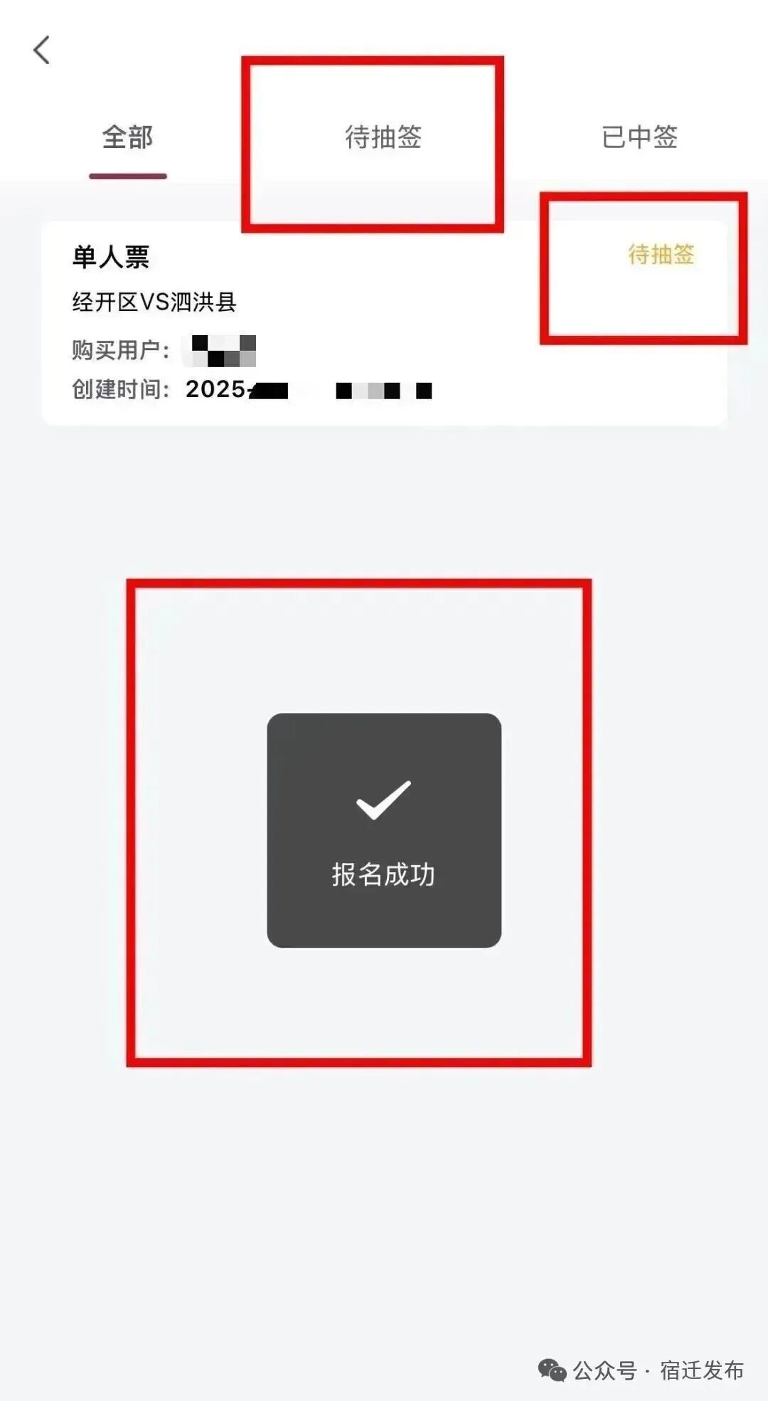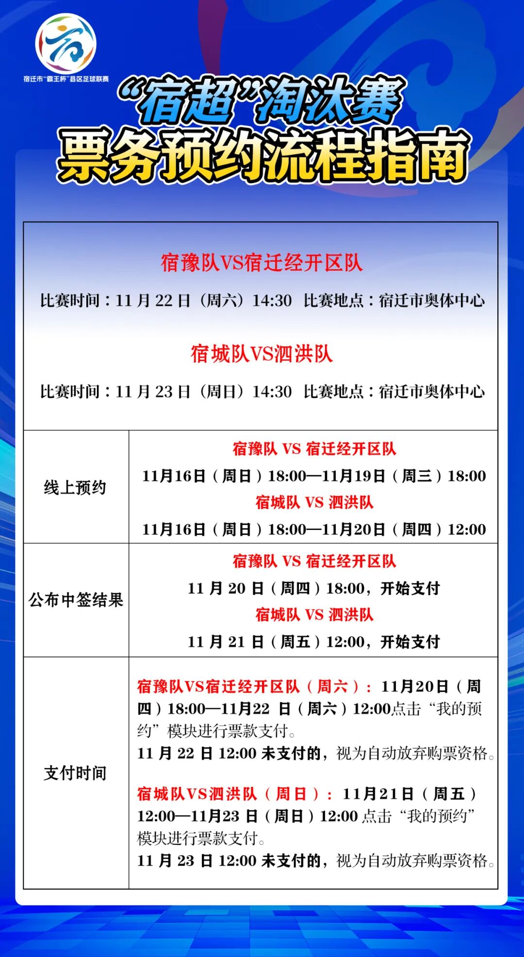 2. 请“宿超”淘汰赛11月22日(周六)场中签的市民和球迷在11月20日(周四)18:00—11月22日(周六)12:00点击“我的预约”模块进行票款支付,同时购票平台“我的券码”内将更新票务信息。11 月 22 日 12:00 未支付的,视为自动放弃购票资格。