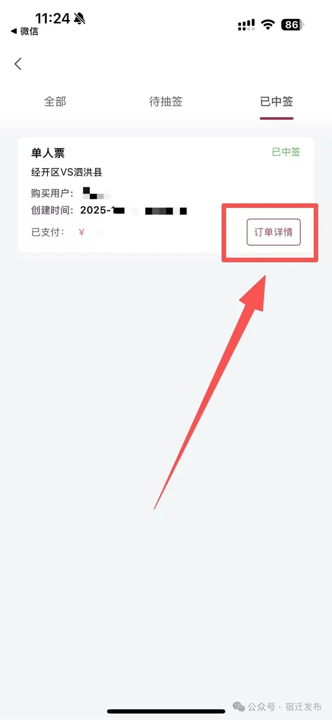 请“宿超”淘汰赛11月23日(周日)场中签的市民和球迷在11月23日(周日)12:00前点击“我的预约”模块进行票款支付,同时购票平台“我的券码”内将更新票务信息,逾期未付将失去观赛资格。