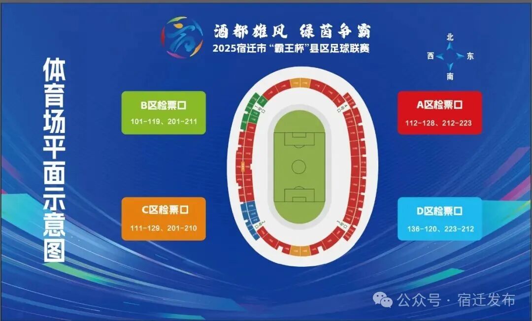 本次比赛设置A、B、C、D四个检票口,其中A、B、C检票口为主队球迷检票通道,D检票口为客队球迷检票通道。具体来看,A检票口通往112—128区、212—223区;B检票口通往101—119区、201—211区;C检票口通往111—129区、201—210区;D检票口通往136—120区、223—212区。