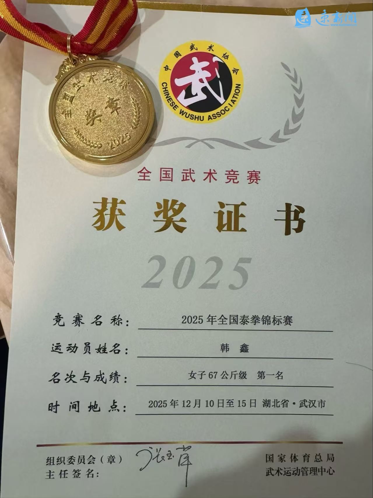 (速新闻记者 赵淑柳)2025年全国泰拳锦标赛于12月15日在武汉体育学院圆满落幕。经过6天激烈角逐,泗洪籍选手韩鑫在女子67公斤级比赛中脱颖而出,夺得第一名。
