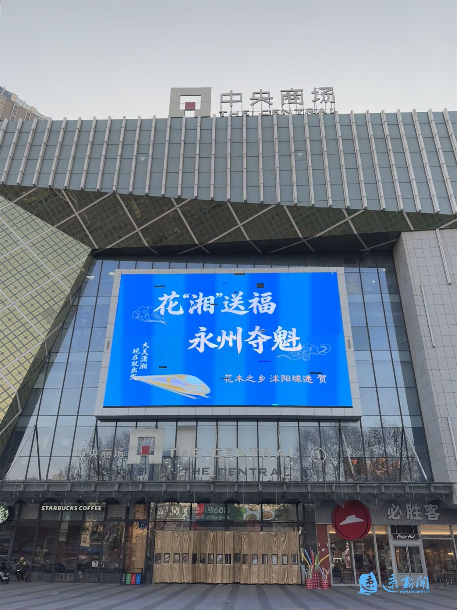 (速新闻记者 裴凌曼)近日,湖南永州夺得湖南省足球联赛(湘超)冠军后,吸引江苏多地网友的隔空祝贺。1月7日,在“花木之乡”沭阳的中央商场大屏前,有球迷点亮巨型灯牌,打出“花‘湘’送福 永州夺魁”的醒目标语,以独特的方式向永州队送上祝福。