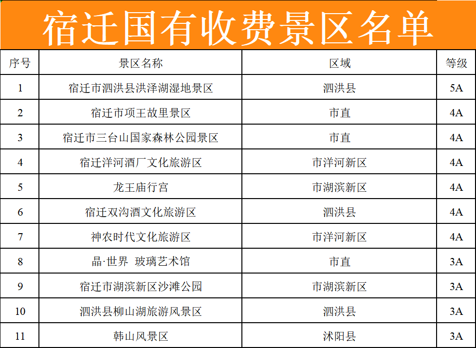 2. 1月17日—18日,宿迁面向全省十三个地级市市民实行全市国有收费景区免费入园政策。