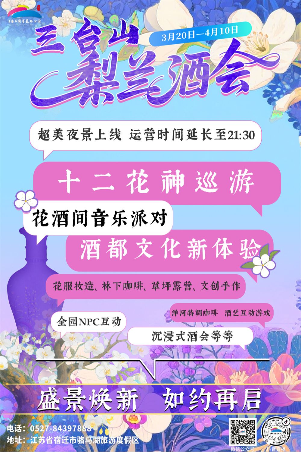据了解,三台山梨兰酒会是宿迁春日标志性文旅品牌,依托景区得天独厚的梨兰花海资源,深挖本地酒文化、生态文化内涵,持续创新活动形式,不断丰富文旅业态,既为市民提供了踏青休闲的好去处,也成为展现宿迁城市魅力、推动文旅融合发展的重要窗口。